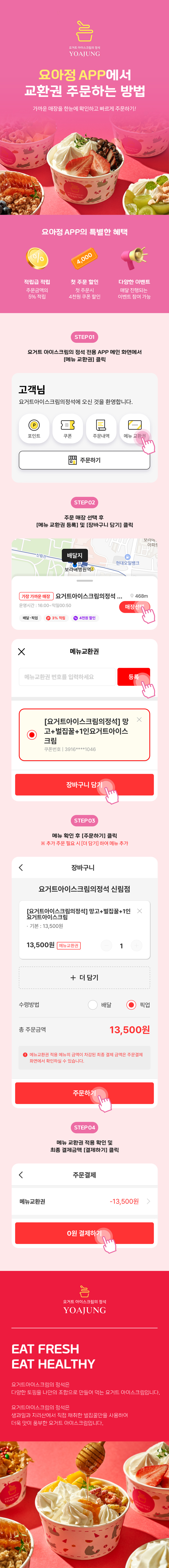 요거트아이스크림의정석 APP 접속 → 메뉴교환권 → 주문매장 선택후 메뉴교환권 등록 및 장바구니 담기 → 메뉴확인 후 주문하기 → 메뉴 교환권 적용 확인 후 결제하기